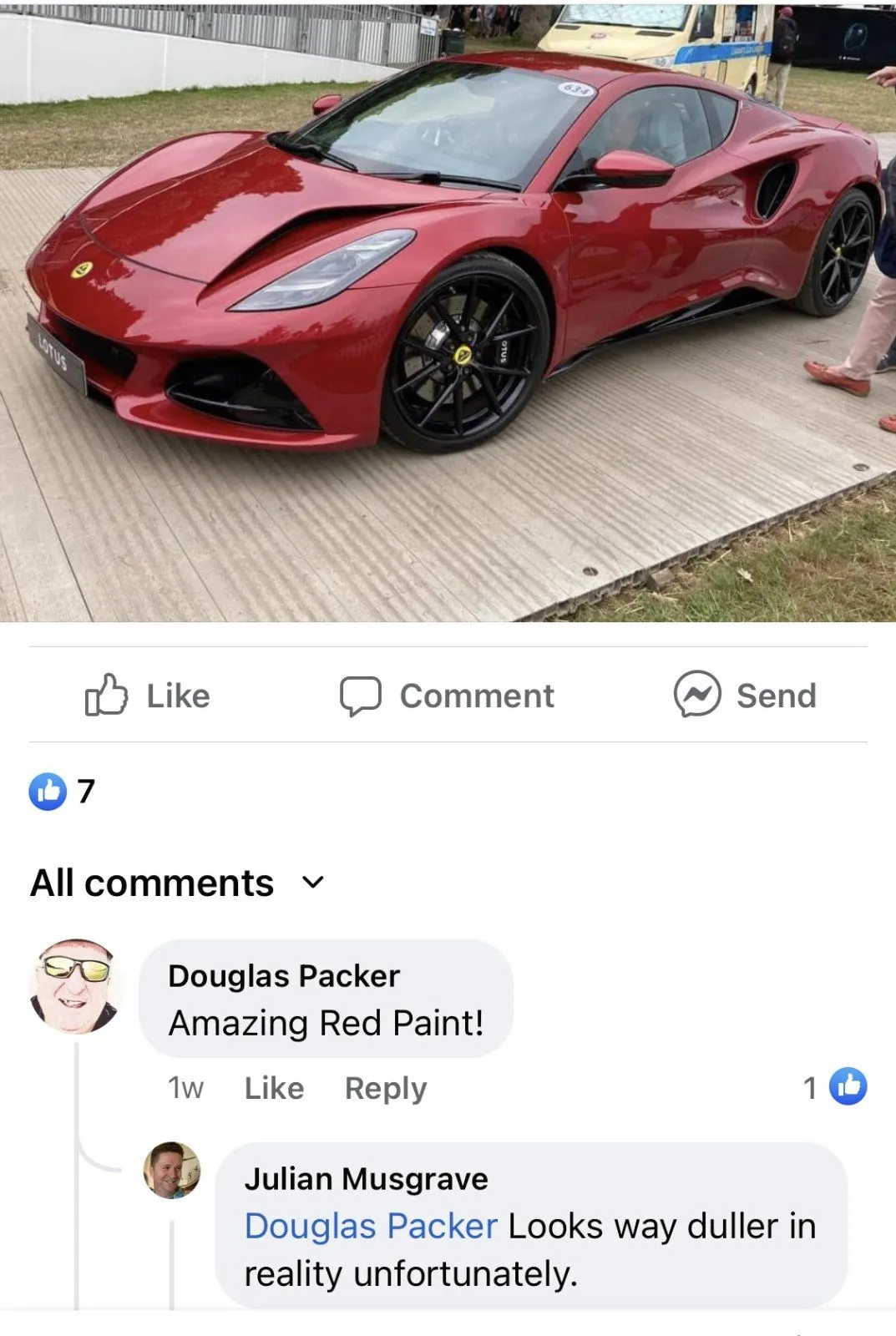 Yeah it looks like they shifted some of the blue channel out, and moved more of the red/orange channel in to give the red that rich, vibrant look. You're right, the color change and saturation in the Lotus center cap on the wheel gives away what they did to the photo.Yeah, the key is the Lotus badge on the wheels — completely over saturated. Which is a shame.