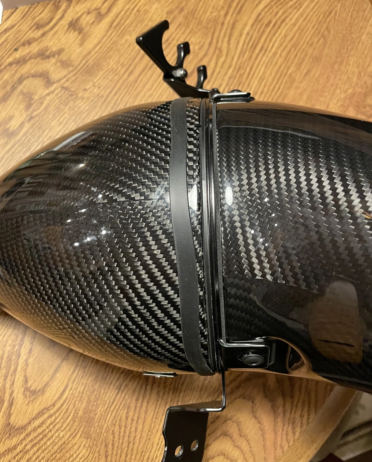 When reattaching the other body half, make sure the drain hole (you can see it inside in the picture below) is on the bottom facing down. Reassemble the 3 tab screws (don't forget the black washers) with the lock nuts, and again, just snug them down; don't over-tighten or you risk cracking the carbon fiber. The last step is to pull that rubber band around the body, over the seam (see first picture above) where the two body halves meet. Now you're ready to re-install the Eventuri back in the car.