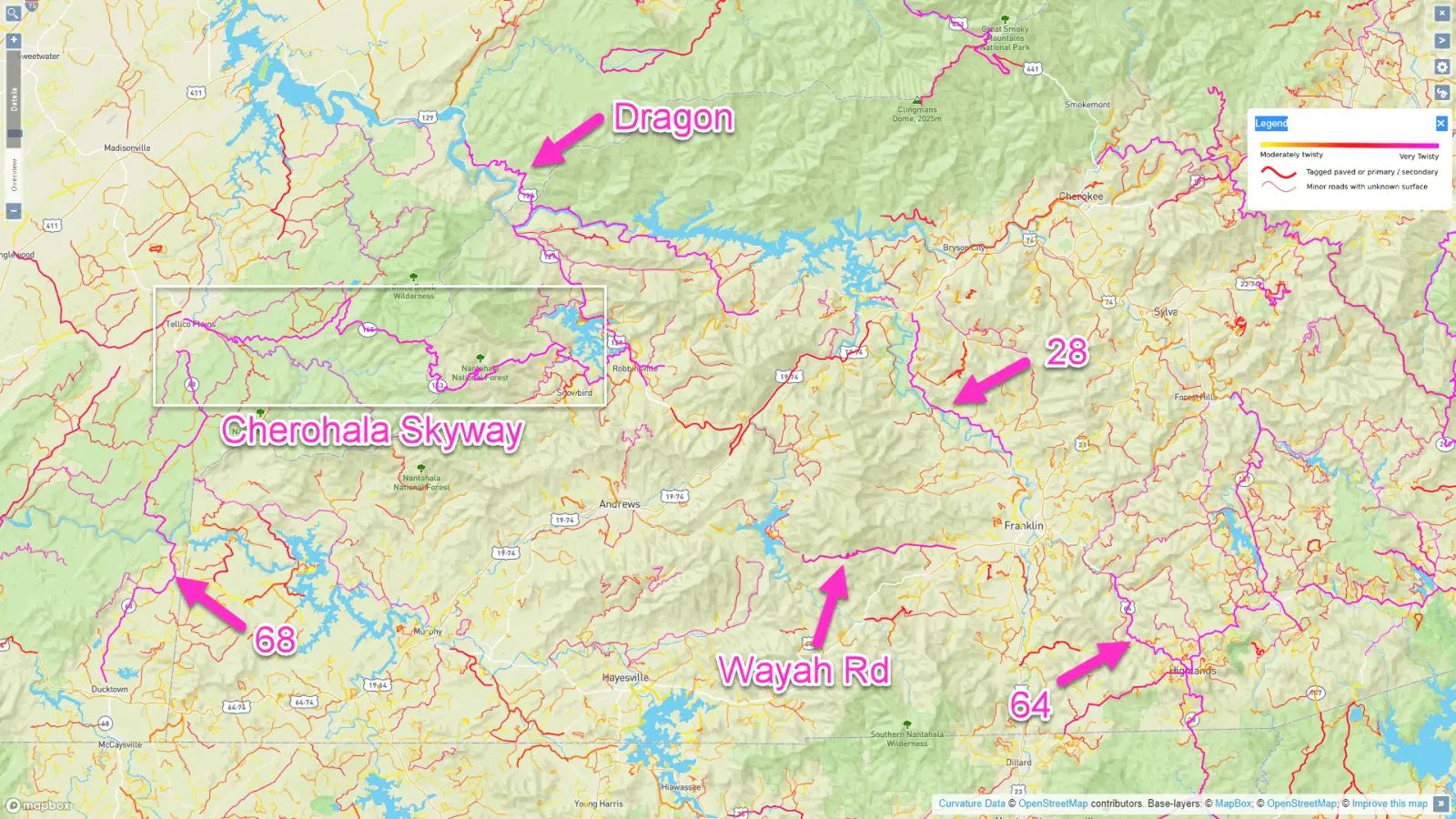 I mean, I've been to Deal's Gap more than 25 times. The Dragon is a fantastic road, but in my opinion it's not even the best road in that specific area. Examples below. It's just unusual in that it hugs the edge of a National Park so it doesn't have any adjacent development or entrance/exits for other traffic.
