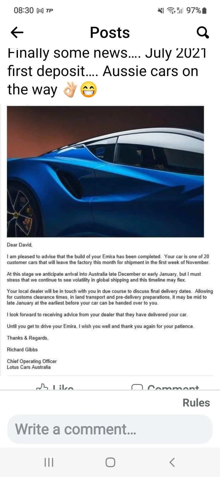 Lotus Bullsh1t.One minute we are told that only left hand drive cars can be build because of parts supply issues. And now we here that 20 right hand drive cars are heading to Australia. So UK can't have cars but Australia can as there is no issue with parts. You couldn't make it up. Names out of a hat I still think.