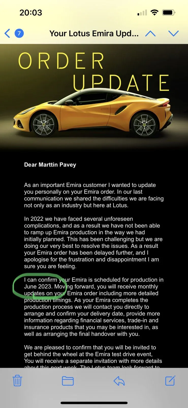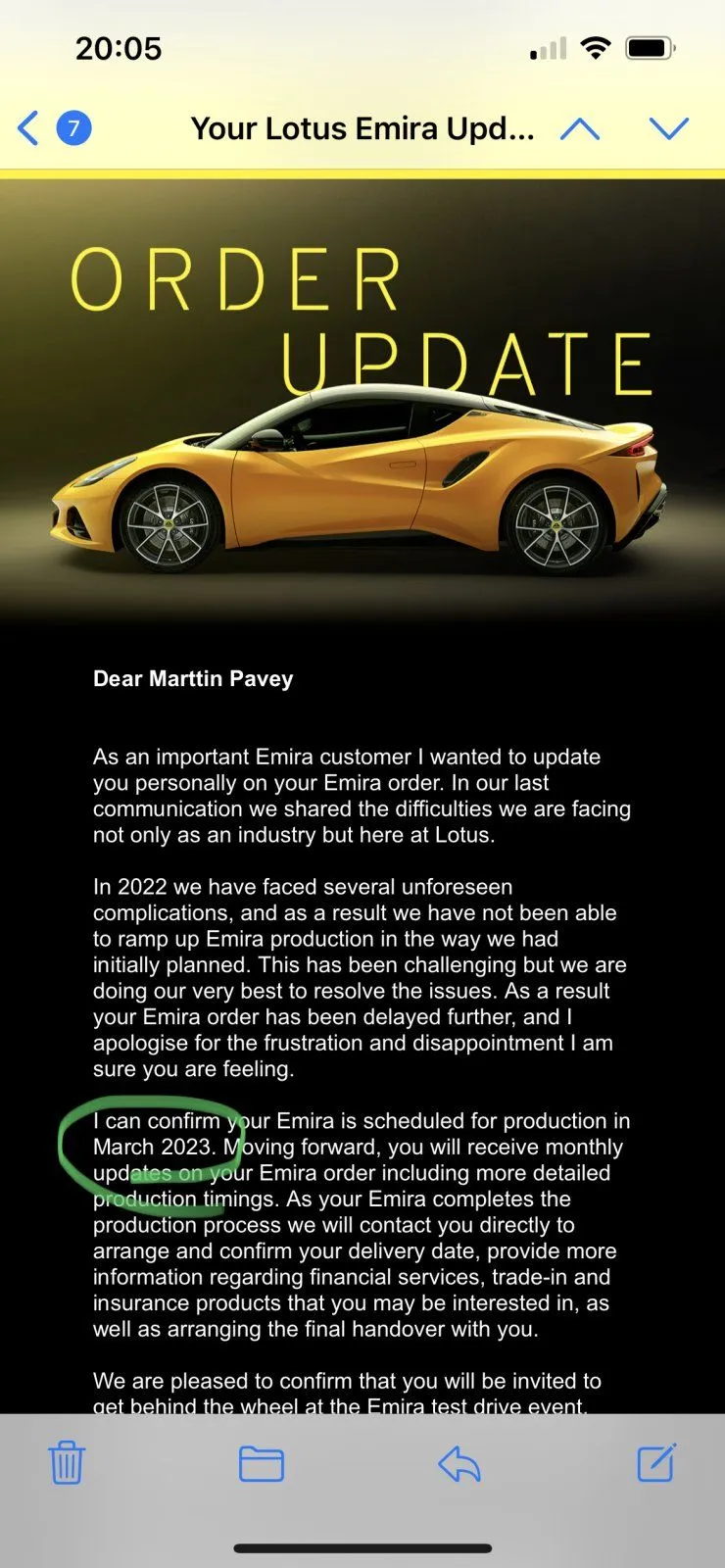 So, while I'm sympathetic, I am just trying to stop the feeling that Lotus have suddenly delayed manual boxes again by some extra 3 months.... this is not the case. Its just that they are now continuing the last 10 days emails to their customers, but nothing has changed, in reality if you follow the forum and waste a lot of time like me.. haha.. you would have already had a pretty good idea that you were going to be 2023 and March would be a good guess based on your deposit date.