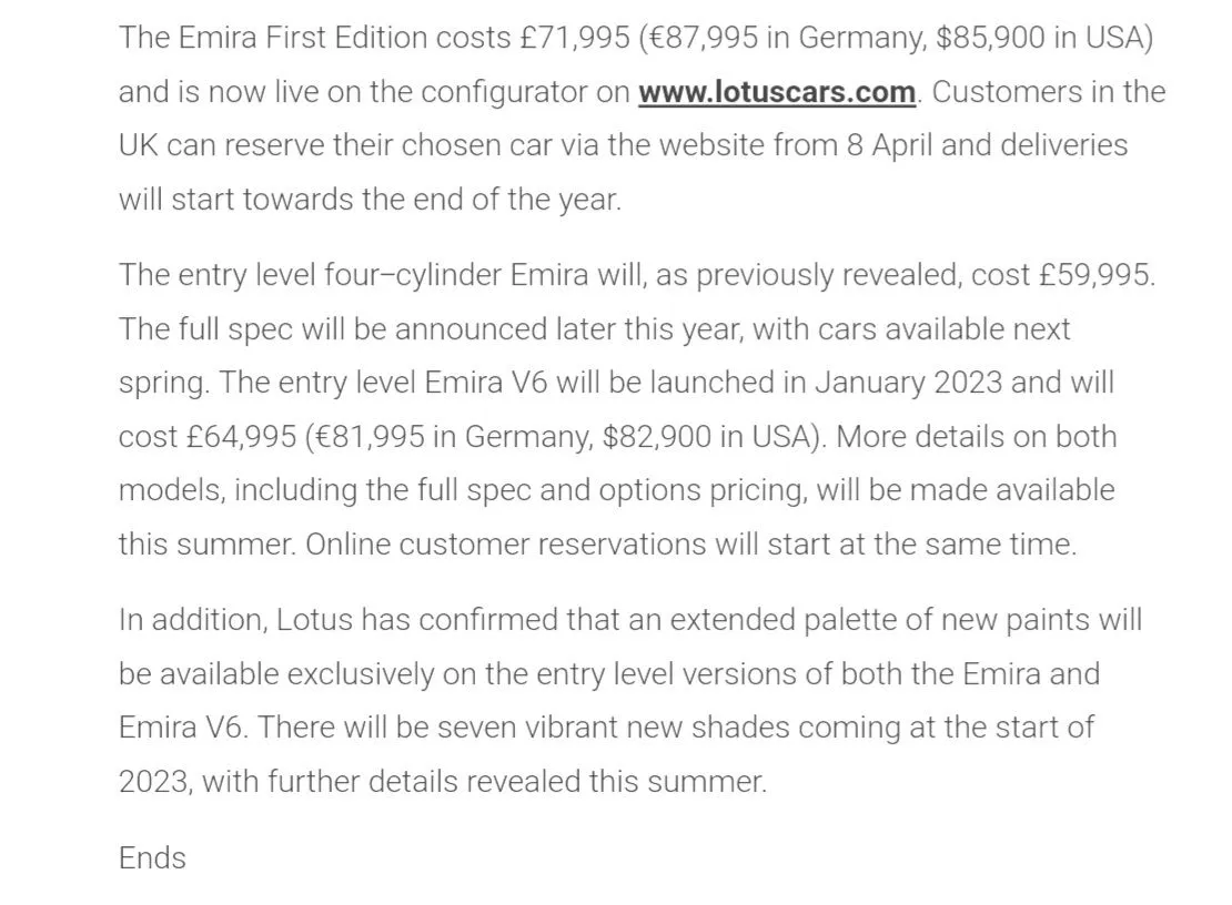 To be fair, Lotus said late last year they would announce i4 FE pricing and specs in March 2022 and they did.Remember when we were supposed to get official pics of painted Emiras last October? I'm betting base configurator and pricing will be Jan 2023.