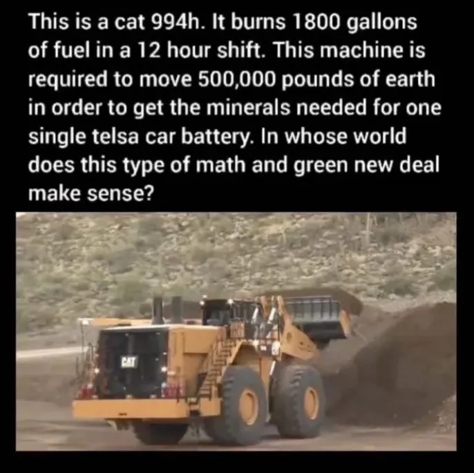 There's also the cost of mining. I saw this image and thought the fuel consumption figure seemed awfully high. I checked into it and believe it's a typo. The actual fuel consumption of a 994H seems to be about 65-70 gallons per hour, so for a 12 hour shift it would be about 800 gallons of fossil fuel used, not 1800. Still it's shockingly non-green if every one of these machines required to mine the minerals is using 800 gallons every 12 hours. With the rising price of gas, that's going to add to the cost of making batteries. Even if the price of gas is just $5 per gallon, that's $4,000 a day per machine just in fuel costs. Then transportation costs to the plants that make the batteries.