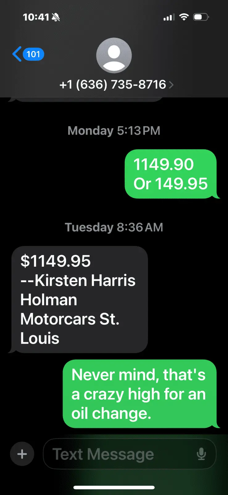 Just wanted to say hi to a fellow KC Emira owner. Sorry to hear about your issues, hope it’s smooth sailing from here.Holman Motor Sports in St. Louis, I asked first if she meant $149 and if she accidentally added and extra 1 on the total. When she clearly stated she didn’t I asked how much per hour which was 300hr. I told her my friend just got his Lambo Hurrican oil change for $680. She didn’t believe me so I dropped it.