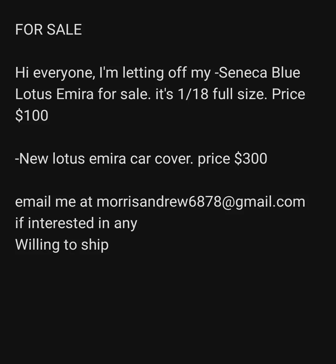 FOR SALE Hi everyone, I'm letting off my -Seneca Blue Lotus Emira for sale. it's 1/18 full size. Price $100 -New lotus emira car cover. price $300
