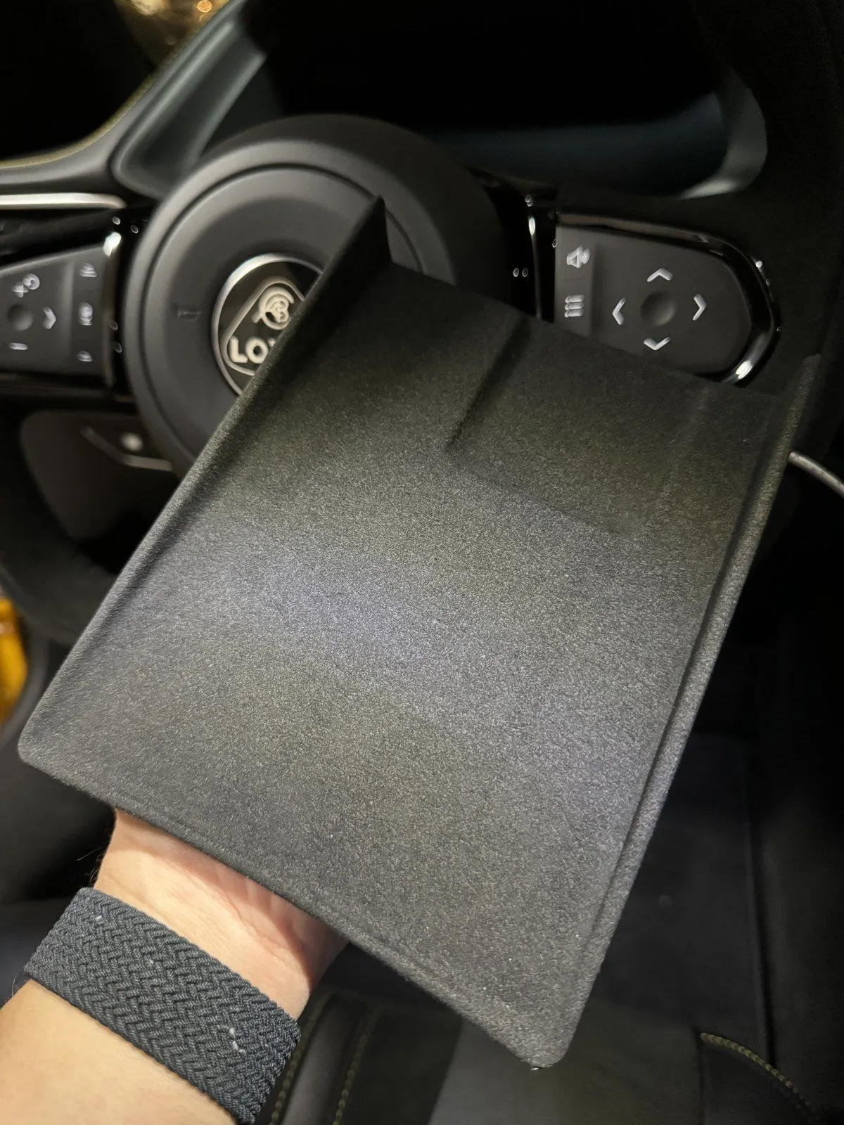 The underside of the tray is not covered in Alcantara . It is common for the areas behind panels to not be upholstered. Doing so is a waste of material. All your OEM panels are wrapped in the same manner. I made sure to wrap around enough past the edges to ensure full coverage of the visible areas and to minimize any lifting. I also didn't want to put more material under the charging puck as this will make it more likely to hold heat. Rest assured that all visible areas will be free of imperfections.