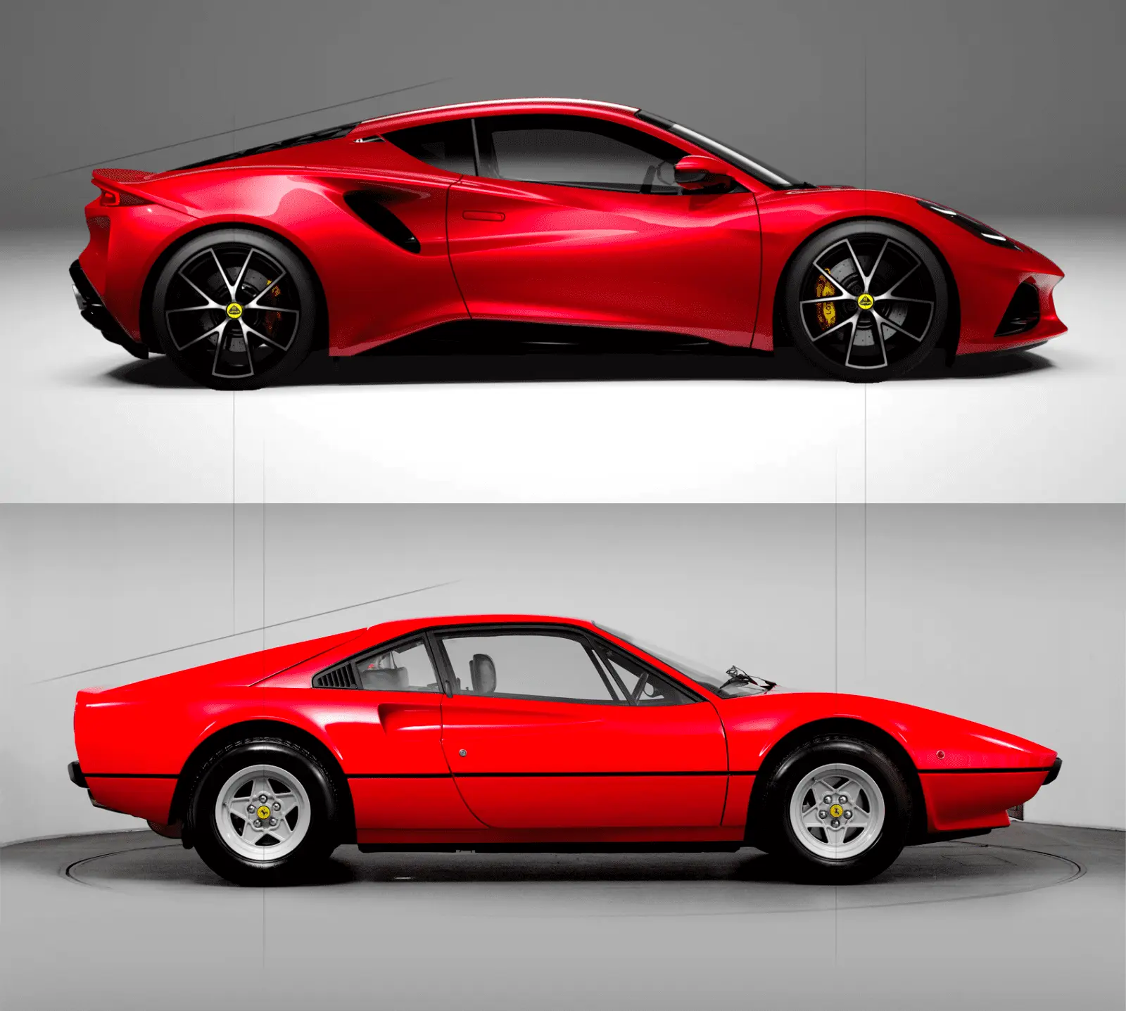 I've been comparing the 308 design to the Emira. The Lotus is more "cab-forward", so the overhangs are shorter: the nose drops off faster, and the proportionate wheelbase length is bigger (the Emira is 182mm longer than the 308, but has a 233mm longer wheelbase). However, the slope of the rear profile is almost identical, and the glasshouse design is very close, even having a dip in the side window inline with the steering wheel.