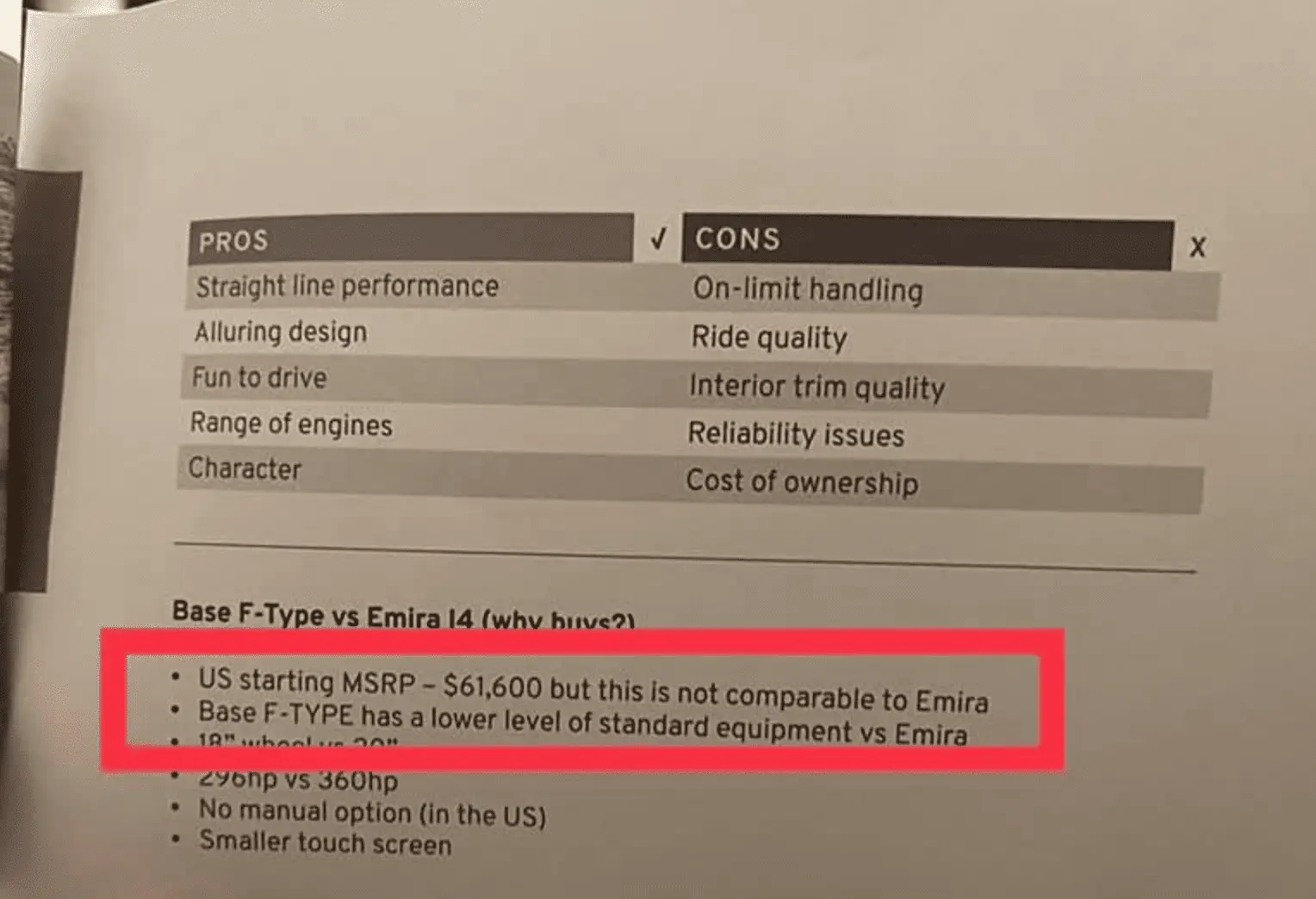 If you look at the F type colours available you can see where the Emira colour palette came from. Having sat in a 2021 F type today I can say the interior is much much better than the Emira, it feels solid and classy materials.Not disagreeing with you, adding context that Lotus made direct comparison to the Base F-Type from the Emira i4 in their official U.S. press points literature at the Laguna Seca event August 11th, 2021.