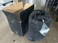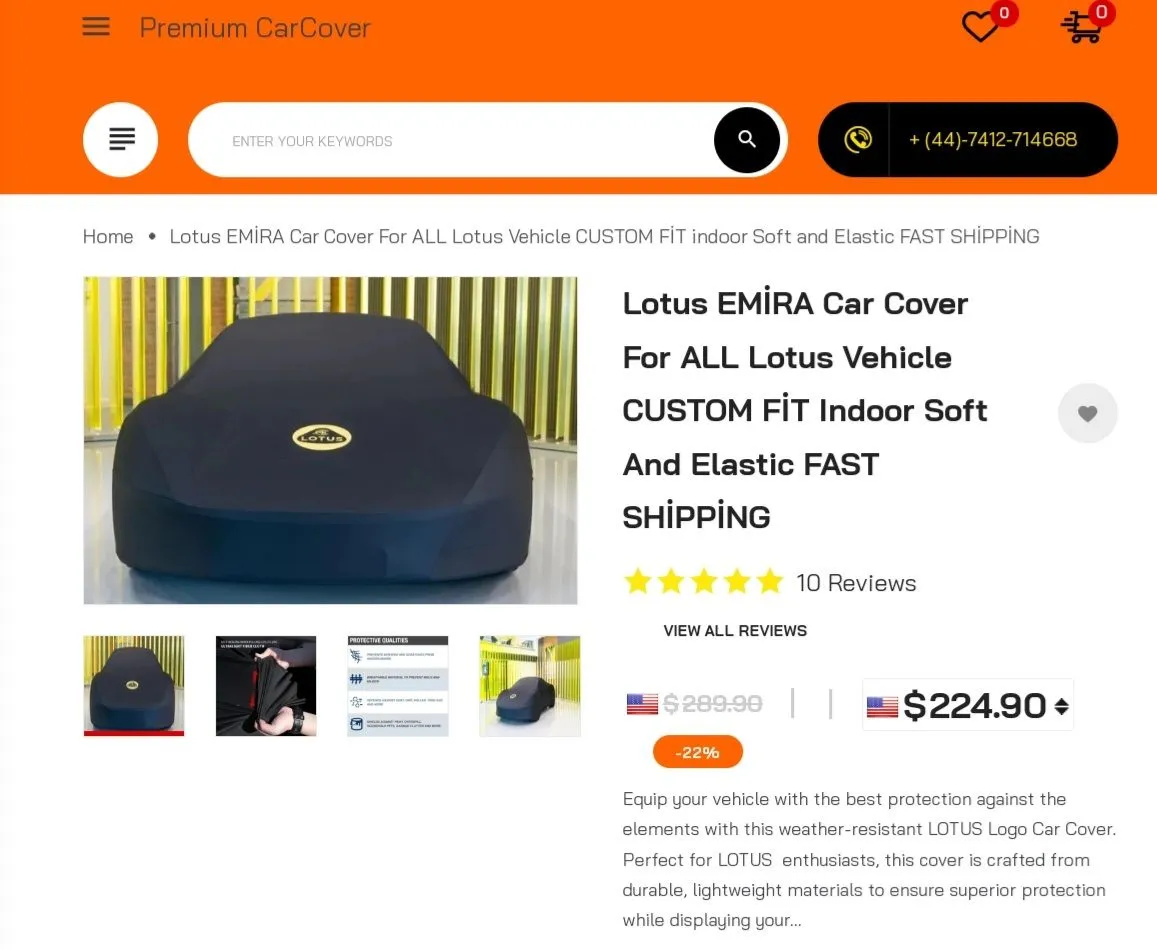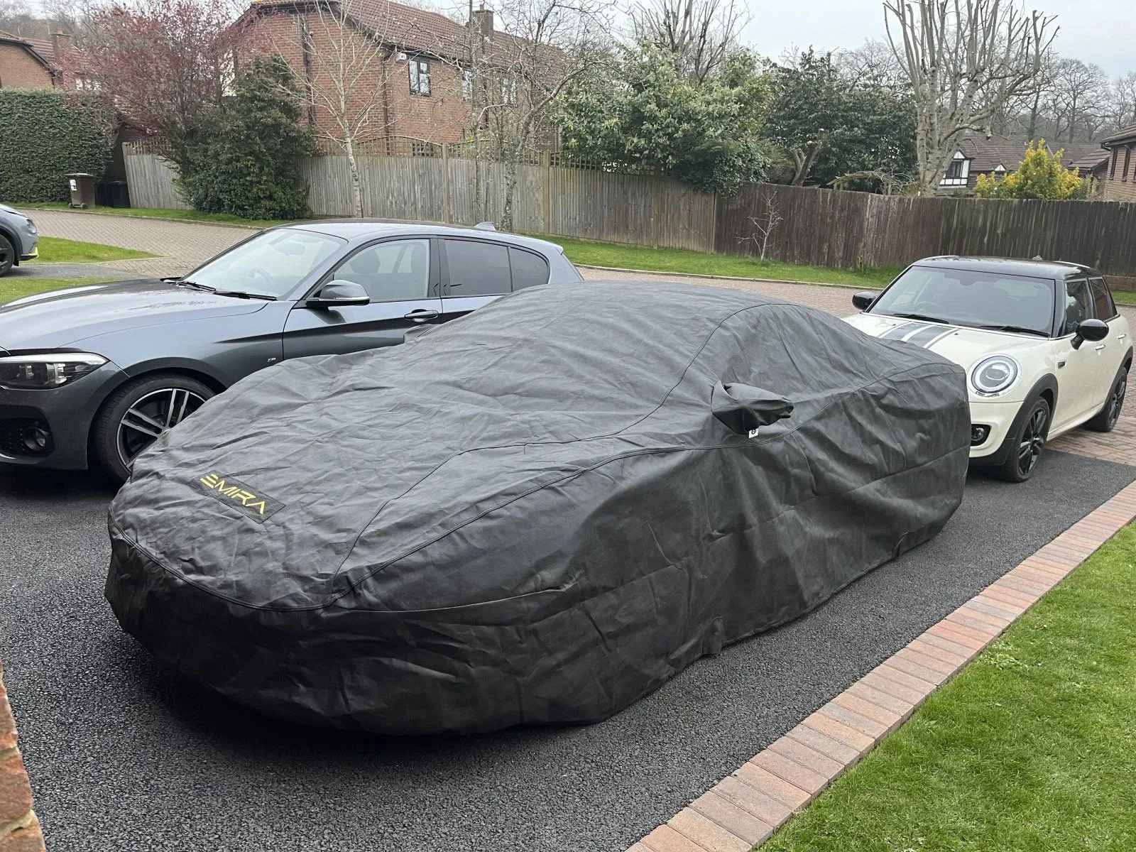 Carcover.ca cover arrived ++quickly w/o any ship charge, as promised. Looks good: one thick layer with a softer underside which contacts the car. Drawstring carry pouch and straps to hold down either end, with elastic edging. True test will be how it fits the Emira, once I get my wheels.