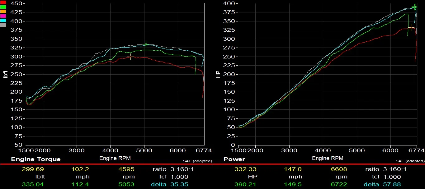 Had some trouble getting the car into test mode initially but the car gained 57.9whp and 33.7 lb-ft over stock and all he has is a valve controller.