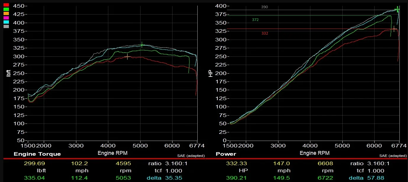 The JB4 dyno I got showed what I felt when switching to Map 1; a definite increase in torque at the lower rpms. What it also shows, is that through multiple dyno pulls spread out over a year with several different mods, once the rpms get close to 5k all the lines pretty much join together. That tells me the exhaust is the bottleneck. I believe all the people showing bigger gains have deleted their 3rd cat which would reduce back pressure and allow for more performance. Most people also seem to be using Dynojets while I'm on a hub dyno which are known to be more conservative.