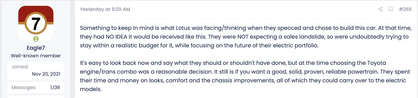 You did baulk at the idea of the Emira not being a 'brand new' car and argued it was. It was mentioned numerous times this just wasn't financially feasible but you rejected that idea because 'matt / lotus said so'. As for carry over, I quoted your post, it wasn't just design you mentioned and I specifically noted 'platform' which indeed doesn't carry over.