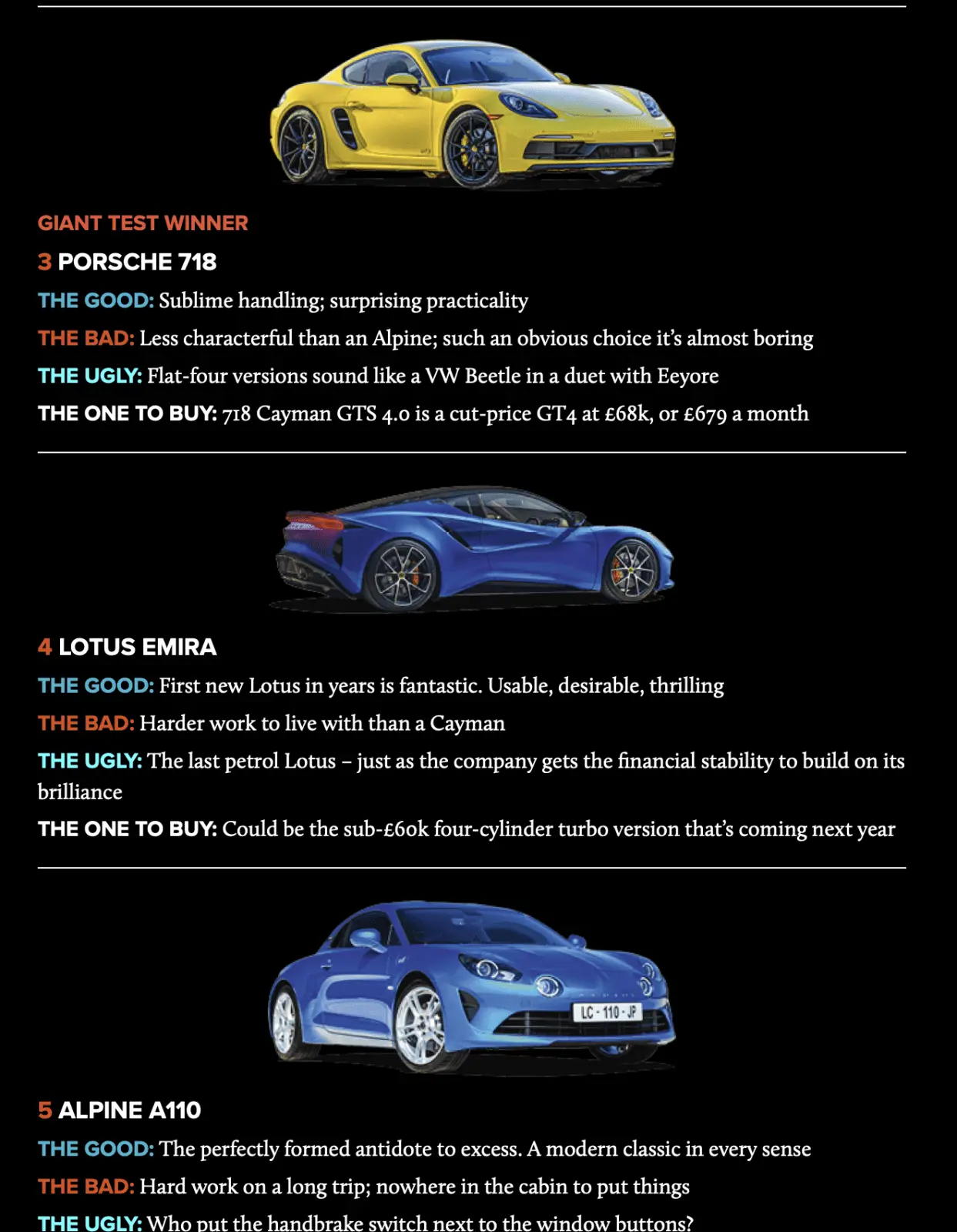 Lotus Emira vs Cayman 718 GTS vs Alpine 110s