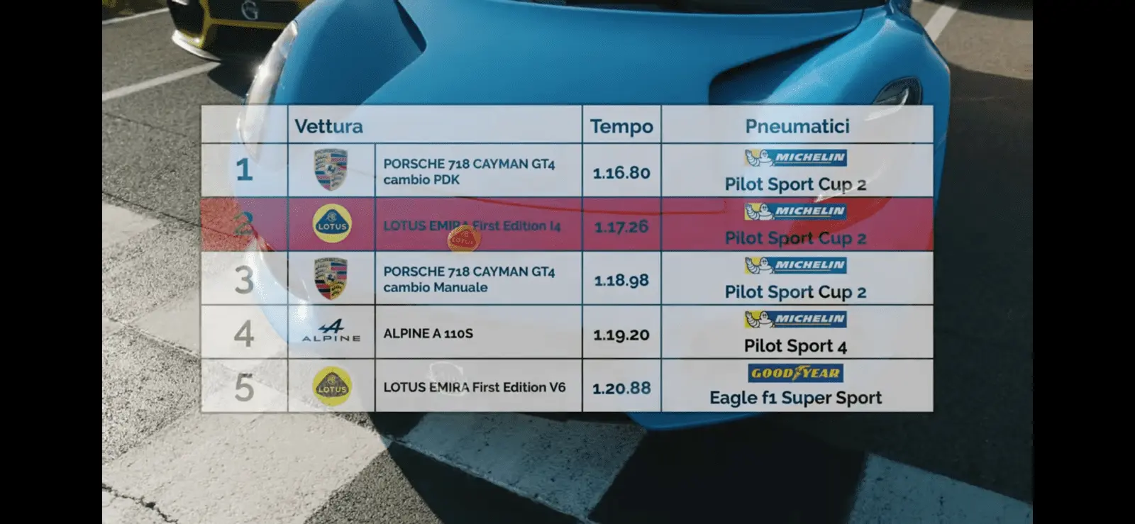 It was only 2 seconds slower than the manual GT4 which was also running Cup2s vs. Goodyear street tires on the Emira. If the Emira was on Cup2s and Sport suspension it very likely would have been a tight race between the two manuals tested.
