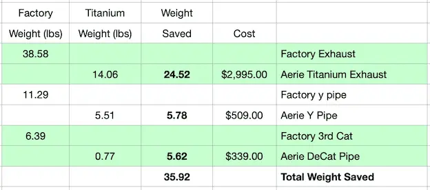 I'm curious to see what their titanium y pipe costs when it's available.Here ya go converted to lbs. If you get the Antigravity battery, which saves about 35 lbs ($949), for about $4,500 you've removed a clean 70 lbs from the back of the car. You would definitely notice that. (The Aerie exhaust includes the DeCat pipe). Now we just need a dyno chart to see what the power and torque gain is from this setup.