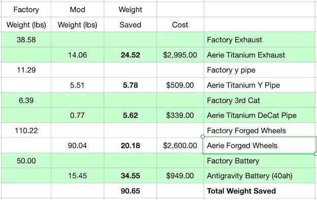 Here ya go converted to lbs. If you get the Antigravity battery, which saves about 35 lbs ($949), for about $4,500 you've removed a clean 70 lbs from the back of the car. You would definitely notice that. (The Aerie exhaust includes the DeCat pipe). Now we just need a dyno chart to see what the power and torque gain is from this setup.