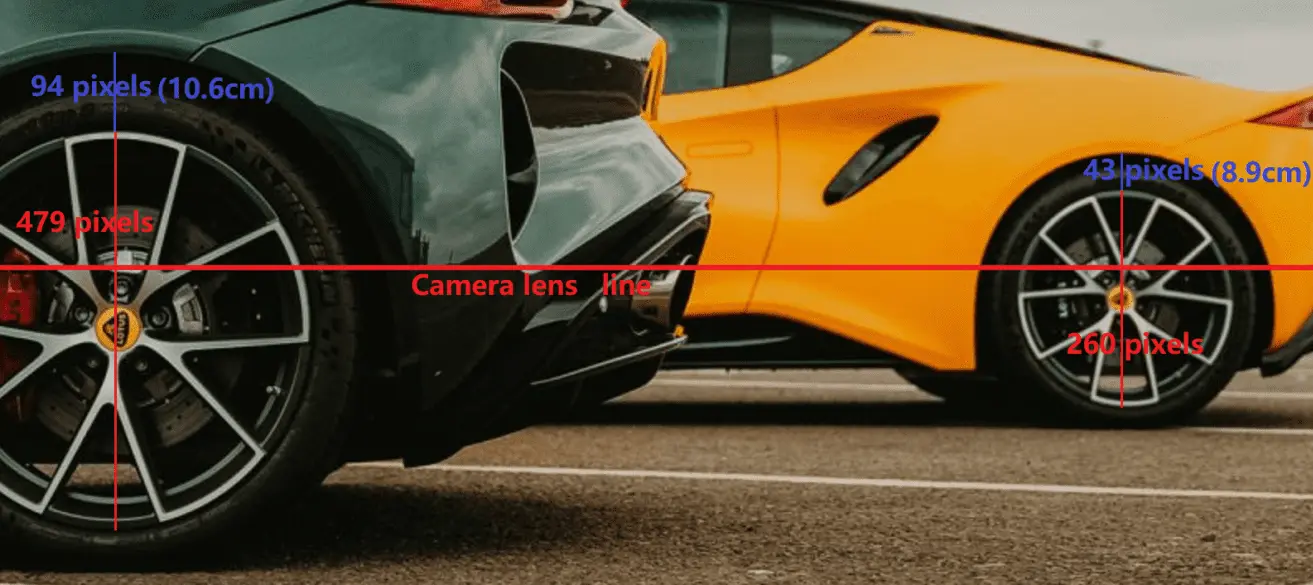 Also, the greater the angle, the smaller the gap will appear. So the green car's tire gap would appear smaller to the eye if you are looking up at a bigger angle...