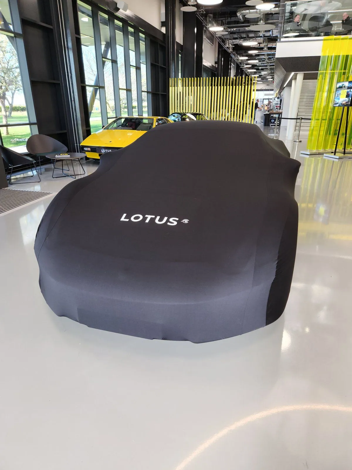 As we drove up to the gates, we could already see the hustle and bustle around the site. Then my first sight of the beast, all covered up, with just a tiny glimpse of the wheels in sight. So, I tried not to look too much at this stage and be patient. First on the agenda however was a bit of lunch to settle us in. Time to talk with Scott about the history of Lotus, where his passion and great knowledge of the firm, its cars, and his own personal pride in delivering a truly worthwhile customer experience is clearly on display.