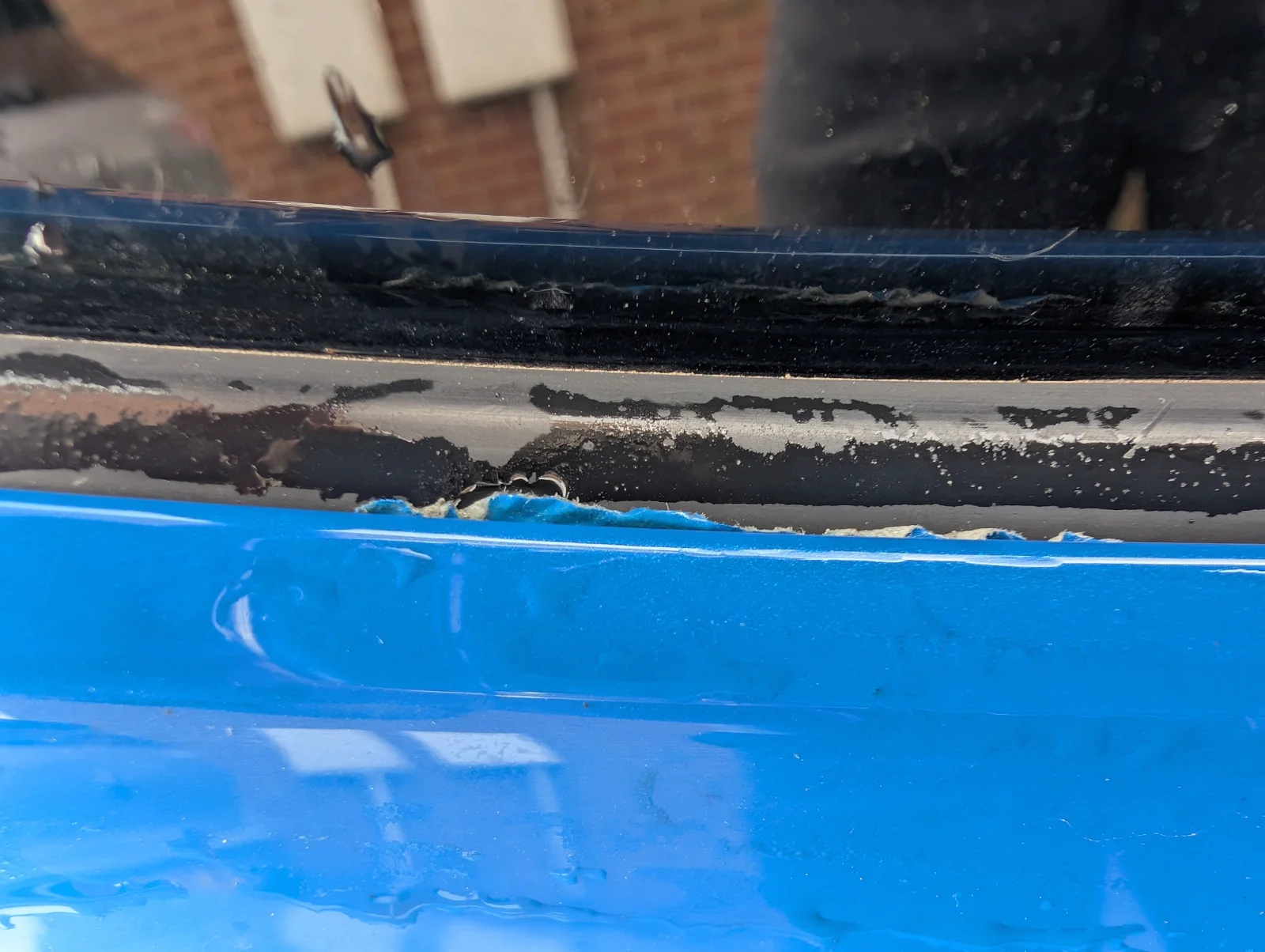 I'm the second owner. It's an ex dealer car and the doors have just been painted.This look like masking tape/material leftover when the panel was repainted. Is this a used car or are you the original owner