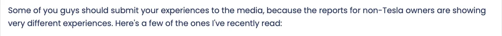 Some of you guys should submit your experiences to the media, because the reports for non-Tesla owners are showing very different experiences. Here's a few of the ones I've recently read: