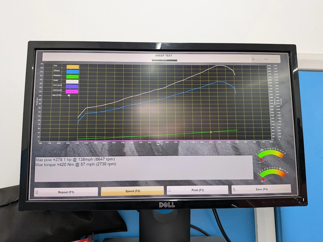 Baseline run was interesting: 379bhp and 420Nm. That's more bhp than I was expecting but slightly lower torque. The car picked up on the fact the front wheels weren't turning so threw up an error code and CEL light which TDI quickly read and cleared. All runs were carried out in 5th gear, Track mode with ESC switched off.