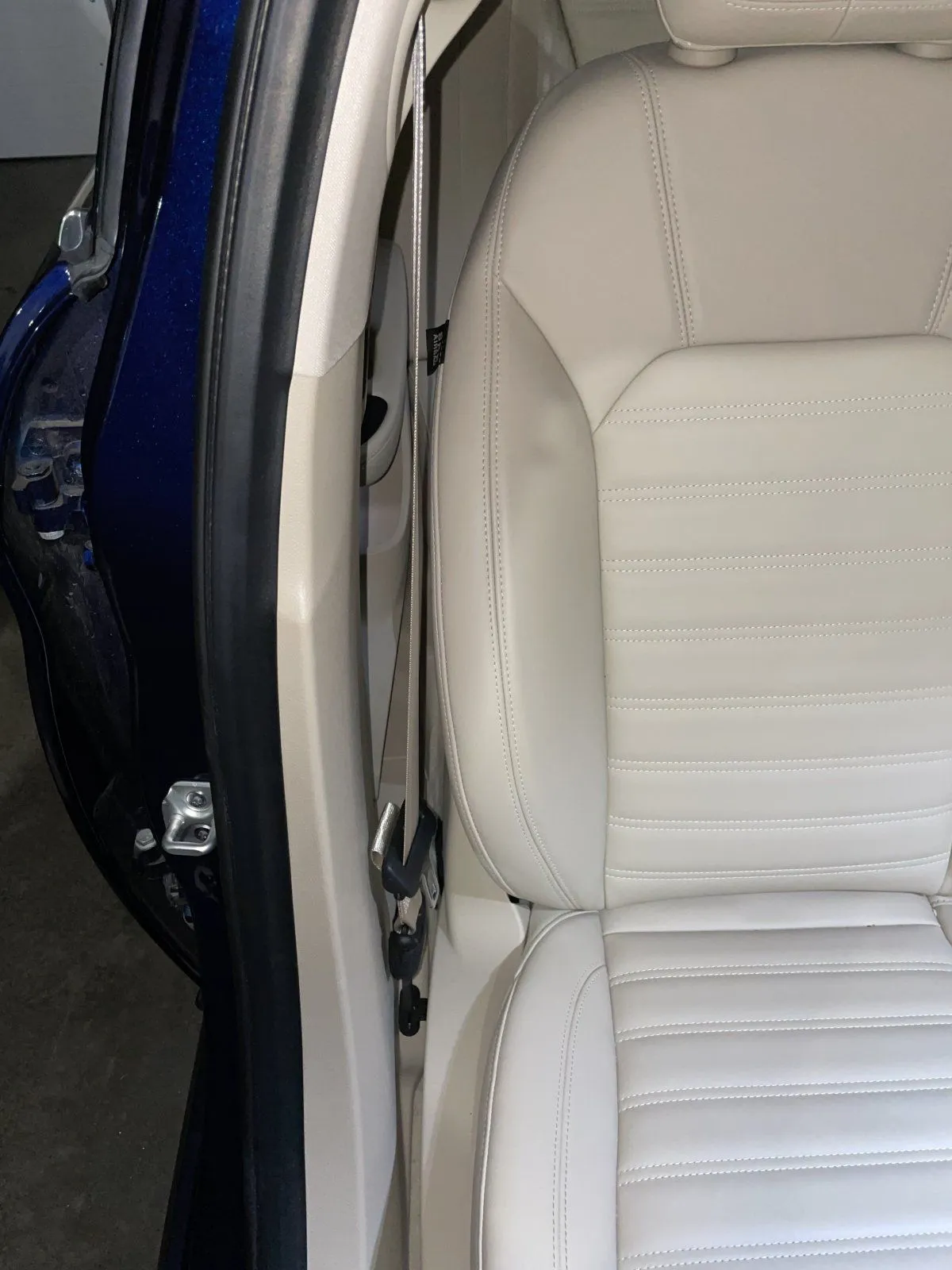 Belt is flat coming up out of the B Pillar, and remains flat all the way down to the fastening point at the bottom. You'll also note that fabric flap coming off the belt behind the blade? That's supposed to be pointing outward, away from the seat.