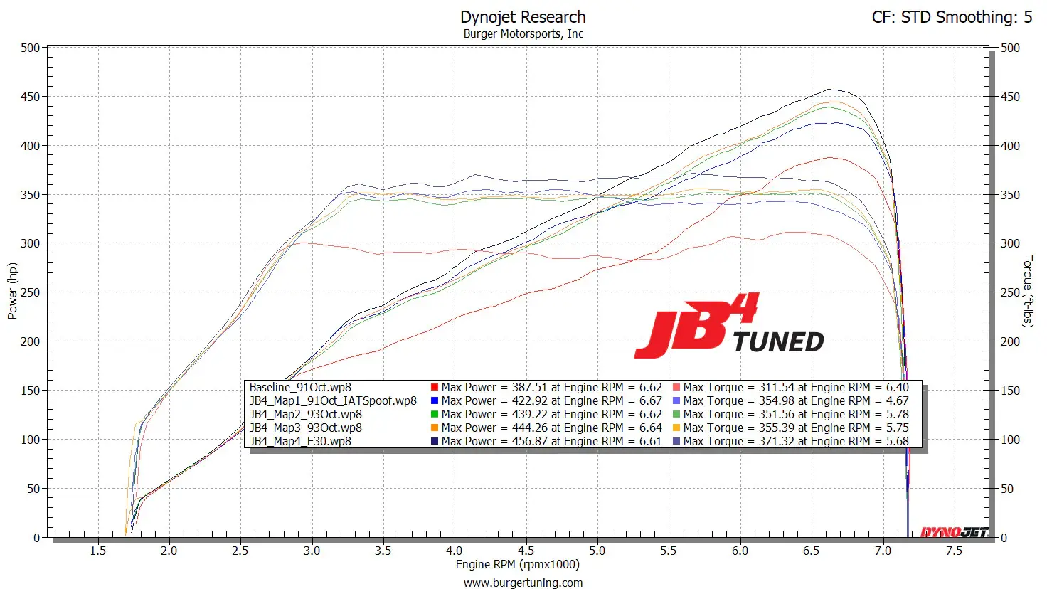 - JB4 Map 4 (E30 Blend): 456.9 hp / 371.3 lb-ft