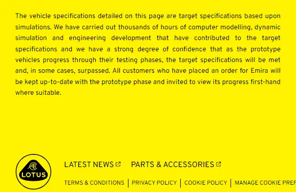 "The vehicle specifications detailed on this page are target specifications based upon simulations. We have carried out thousands of hours of computer modelling, dynamic simulation and engineering development that have contributed to the target specifications and we have a strong degree of confidence that as the prototype vehicles progress through their testing phases, the target specifications will be met and, in some cases, surpassed."