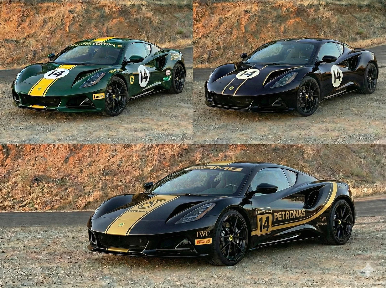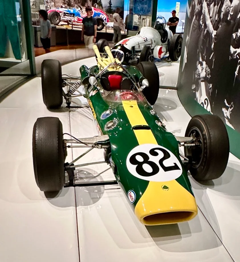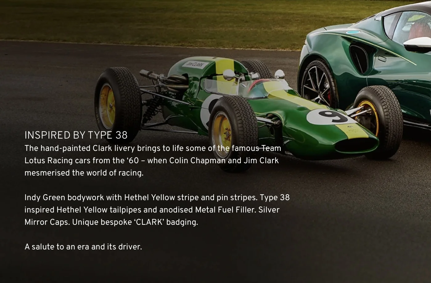 I could not find a pic on the Lotus site, but I assume it looks the same as this Type 38 Jim Clark drove. I think they tried to recreate that look with the Emira Clark Edition.I personally like the straight stripe on the front - Like on the #9 on the Type 38 on the Lotus website