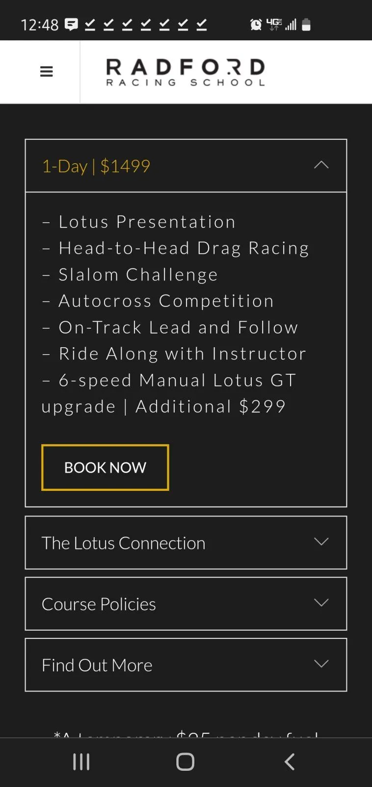 £180 for the taster (about 20-30 mins on track), £720 for intermediate and £960 for advanced. Probably cheaper for you to fly to Hethel and do it thereI'm aware. All 3 options are extremely overpriced and also require a flight and hotel based on my home location.