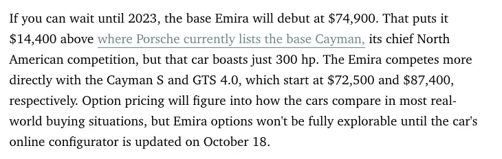 RoadandTrack.com posted an article yesterday about the announcement of U.S. pricing for the Emira. I also noticed they mentioned a full version of the online configurator with options will be available on October 18th. Has this been confirmed anywhere else?