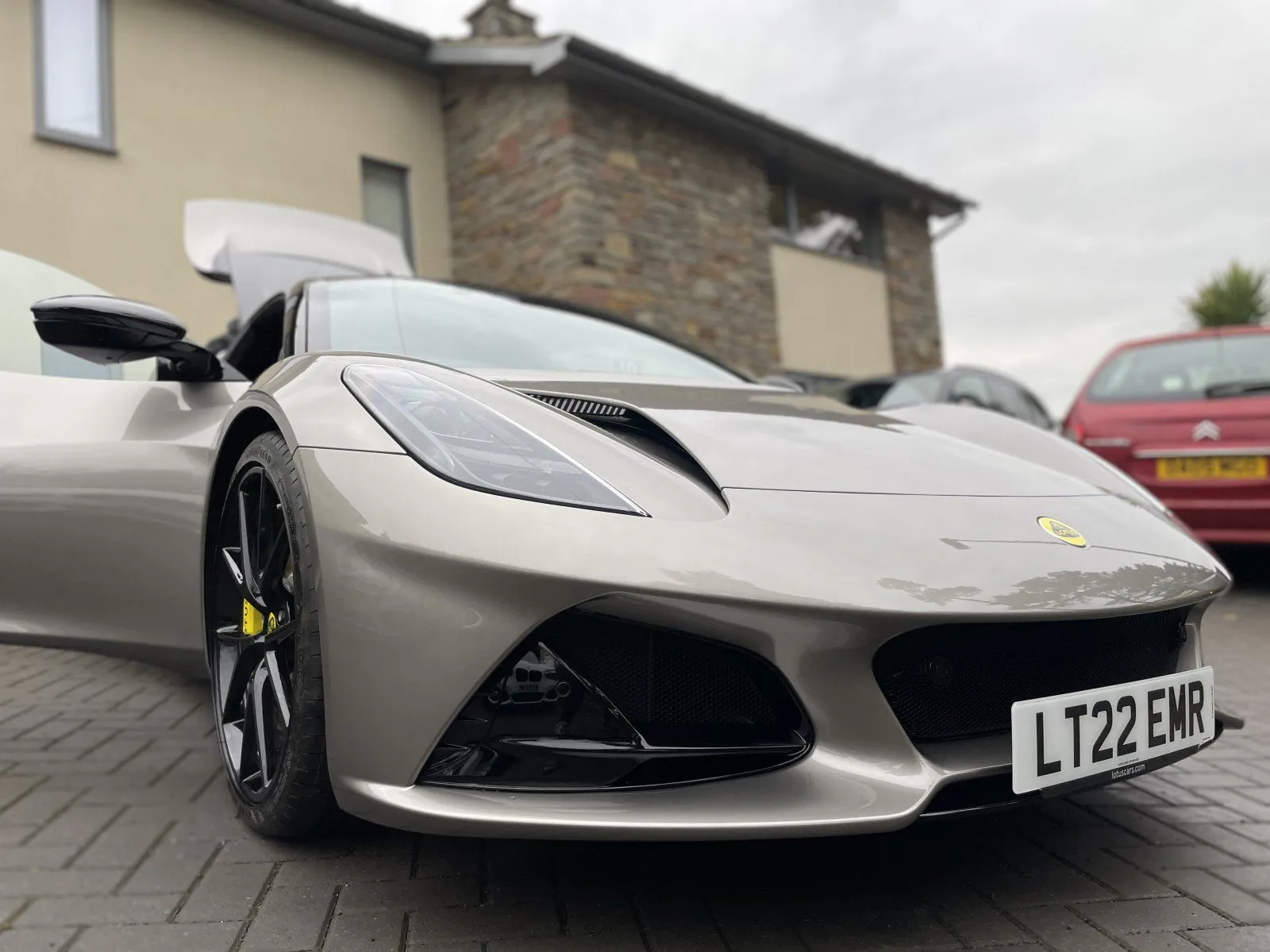 I haven't had a chance to measure the dimensions of the rear LOTUS badge. I've got a feeling its around 53 cm, but if anyone has a firm answer then please fire away as we're getting the car sign-written for general promotion and advertising. Here are photos of the car so if you'd like to - more than welcome suggest a color that blends in well with the Nimbus Grey paint with black pack and wheel combo?