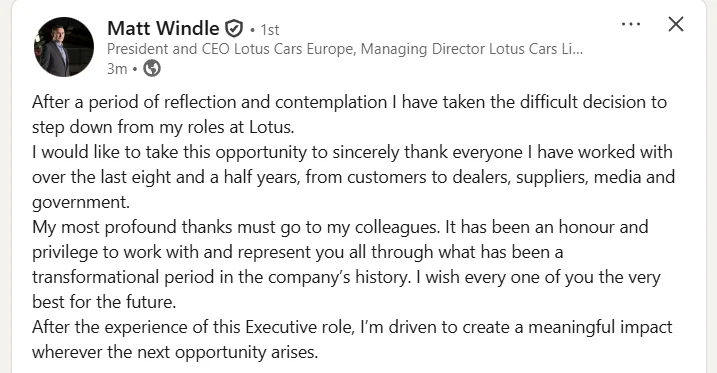 This was a tough role for any exec. I met Matt at the Emira launch at Galpin Lotus. I wish him well in his future pursuits.