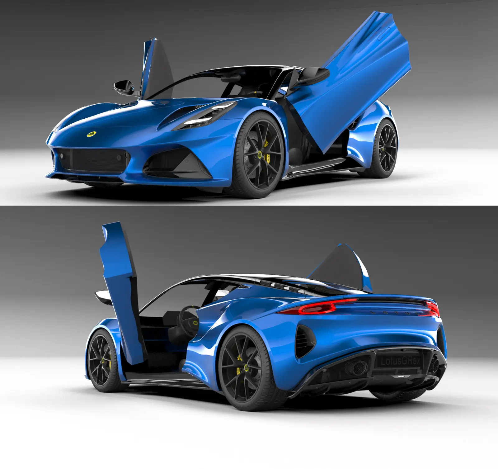 Wouldn’t look totally out of place on an emira like it does on so many other cars.I've been watching too many youtube videos of the Lotus Concept and Evija, so I just lifted the doors on my 3d model out of curiosity.
