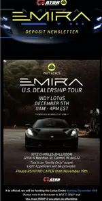 I called Lotus Cars USA to find out when my dealer would get the Emira on the roadshow, and they told me that my dealer is not on the schedule and that not every Lotus factory authorized dealer is on the Emira roadshow tour... I would like to thank Lotus Cars for not acknowledging their depositors/customer base who, in good faith, put deposits down months ago, and that not everyone who put a deposit down will get to see their future purchase in the flesh until they order it and it shows up for them to pick up sometime in the summer of 2022 and beyond. Apparently, this whole roadshow thing is being handled by Lotus UK and not Lotus USA... There are not that many dealers in the USA, how could they not give the car to each dealer for an evening?