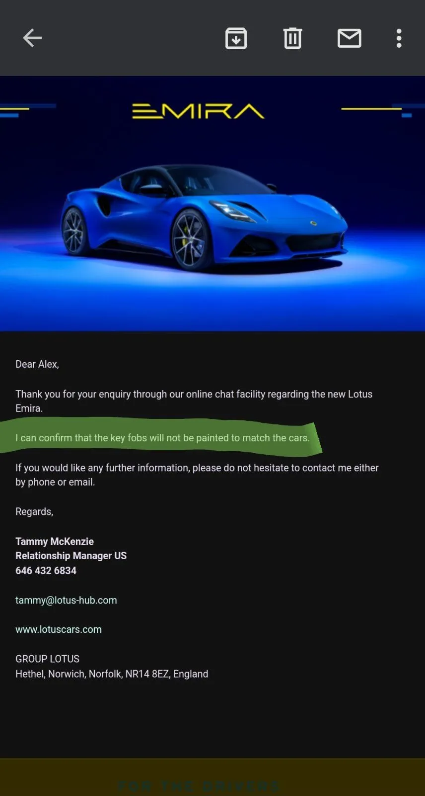 There’s precedence. On the early Evoras folding door mirrors were a cost option. But Lotus fitted the folding mirrors to all cars and just left off the switch. As it was a £10 part from a Ford Mondeo, as soon as that was discovered everyone had folding mirrorsunless the mate is a hobbit, it is a BIG key.... why so big? Ive no idea, but its not ugly and maybe there is some amazing tech in it to be activated later...... I mean, there wont be of course, but as with most things to do with Lotus, we live in hope....