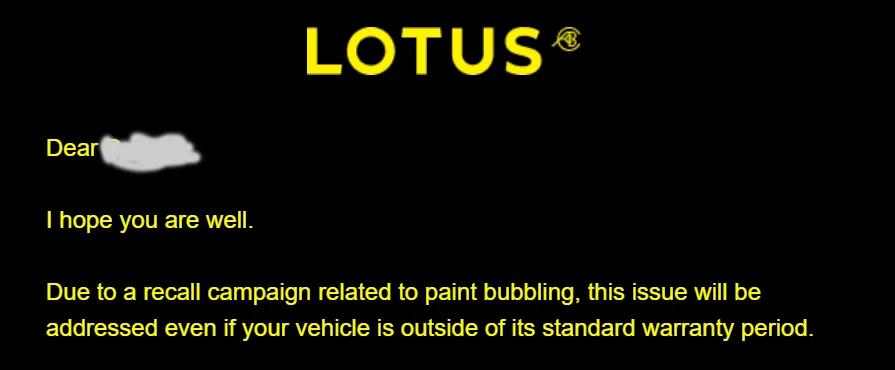 "Regarding your question about the paint issue, I’ve contacted the Warranty team for clarification. They’ve confirmed that the paint blisters (or “bubbles”) are not part of a campaign or recall. Recalls are issued for safety-related concerns that could pose a risk to the driver or passengers and therefore require immediate attention."