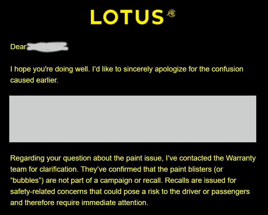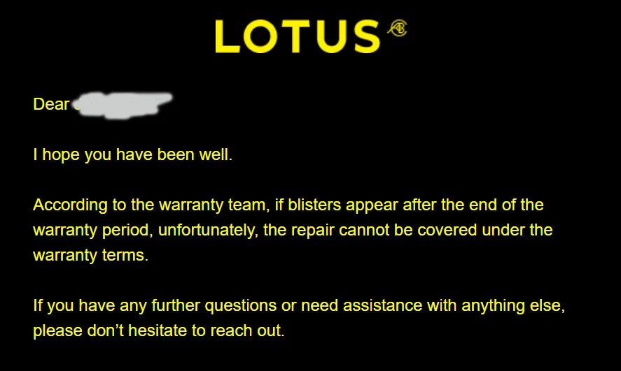 As a life long Lotus fan and serial Lotus owner it pains me to say it, but with this kind of GFY attitude towards their customers Lotus really does not deserve to survive as a business.As the original poster on this issue my concern was about Lotus's position on paint blistering after the car's warranty period has ended. I have been in touch with their (European) customer services in the last couple of weeks to see what their position is.