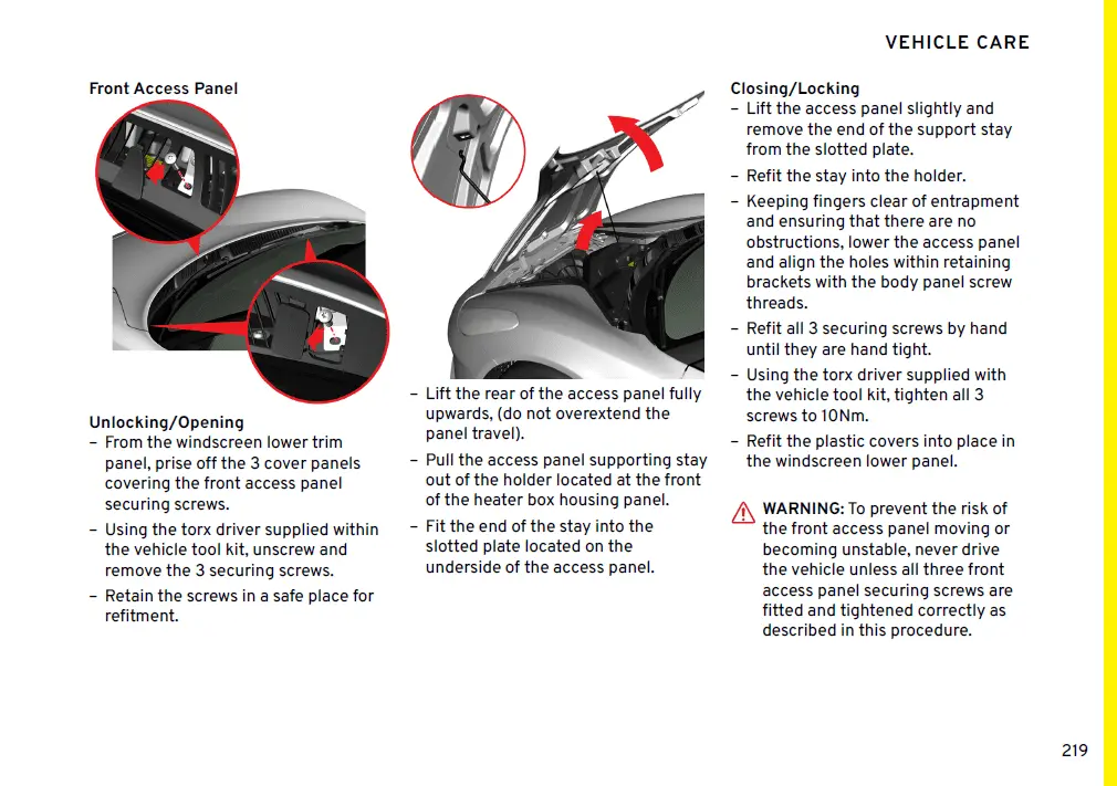 Just provide them with a copy of the appropriate page from the manual, should give them all the knowledge they need.Possibly stupid question: anyone know if the "frunk that's not a frunk" cover has to be removed to do PPF on the front of the car? Was this an issue? Maybe fretting too much but concerned about aftermarket installers trying to open that cover without special knowledge.