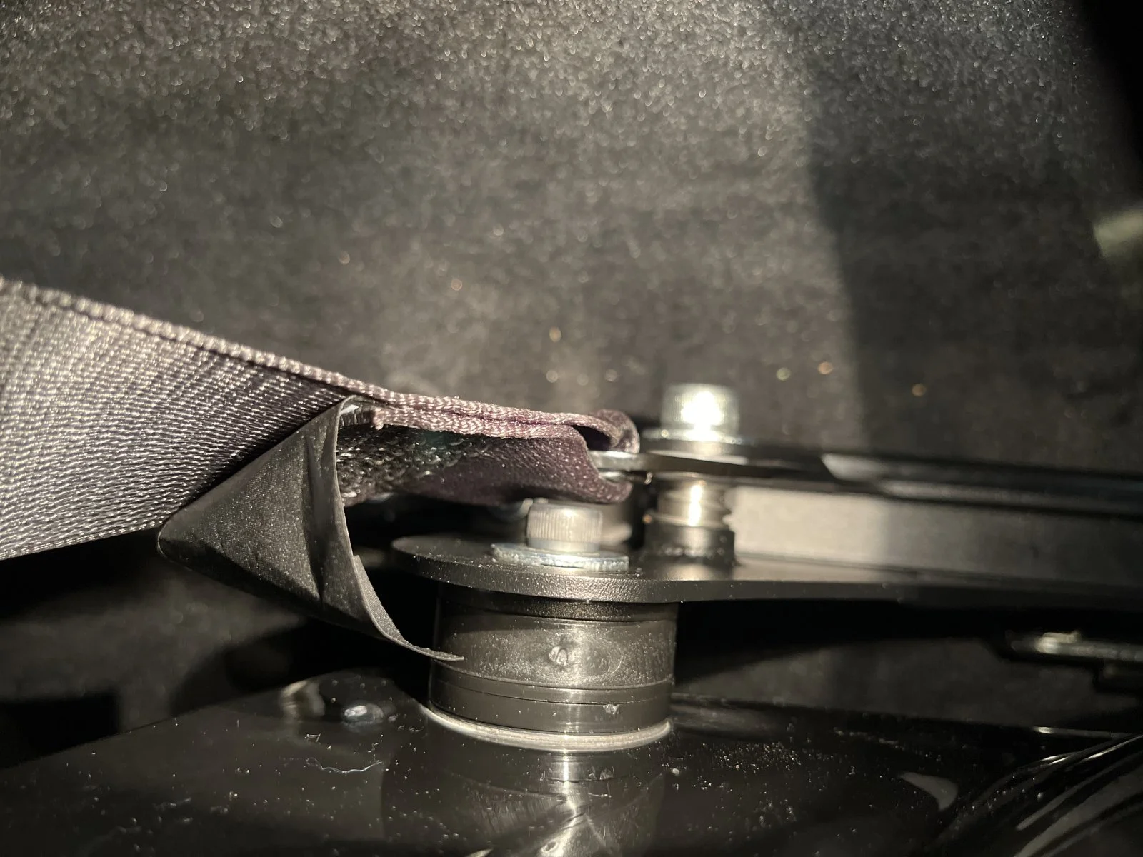 The Tillet seat uses different bolts to mount the seatbelt and seatbelt receptacle. The factory bolts are held in place with tight fitting washers that are designed to spin in place rather than screw off (see photo). I tried to gently pry them up while unscrewing the bolt but ultimately ended up pulling them off with pliers. If I ever decide to reinstall the factory seat, I likely will just have to buy new washers.