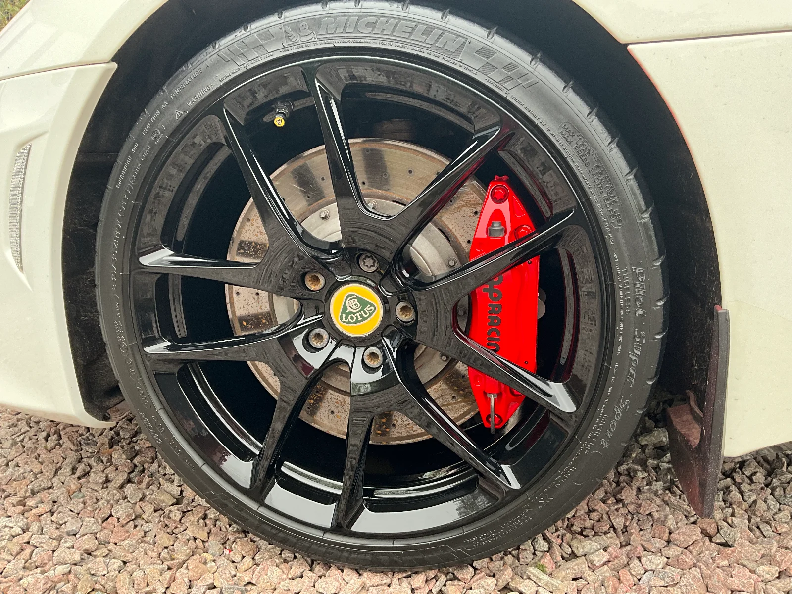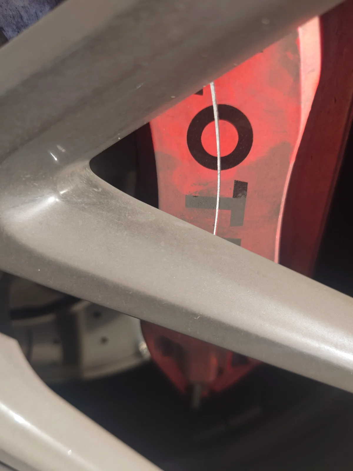 To my dismay, I spotted this white line across my front left brake caliper and upon touching it, I immediately suspected that it was a gouge caused by a rock just big enough to get stuck between the back of the rim and the face of the caliper. There's not much clearance on the fronts.