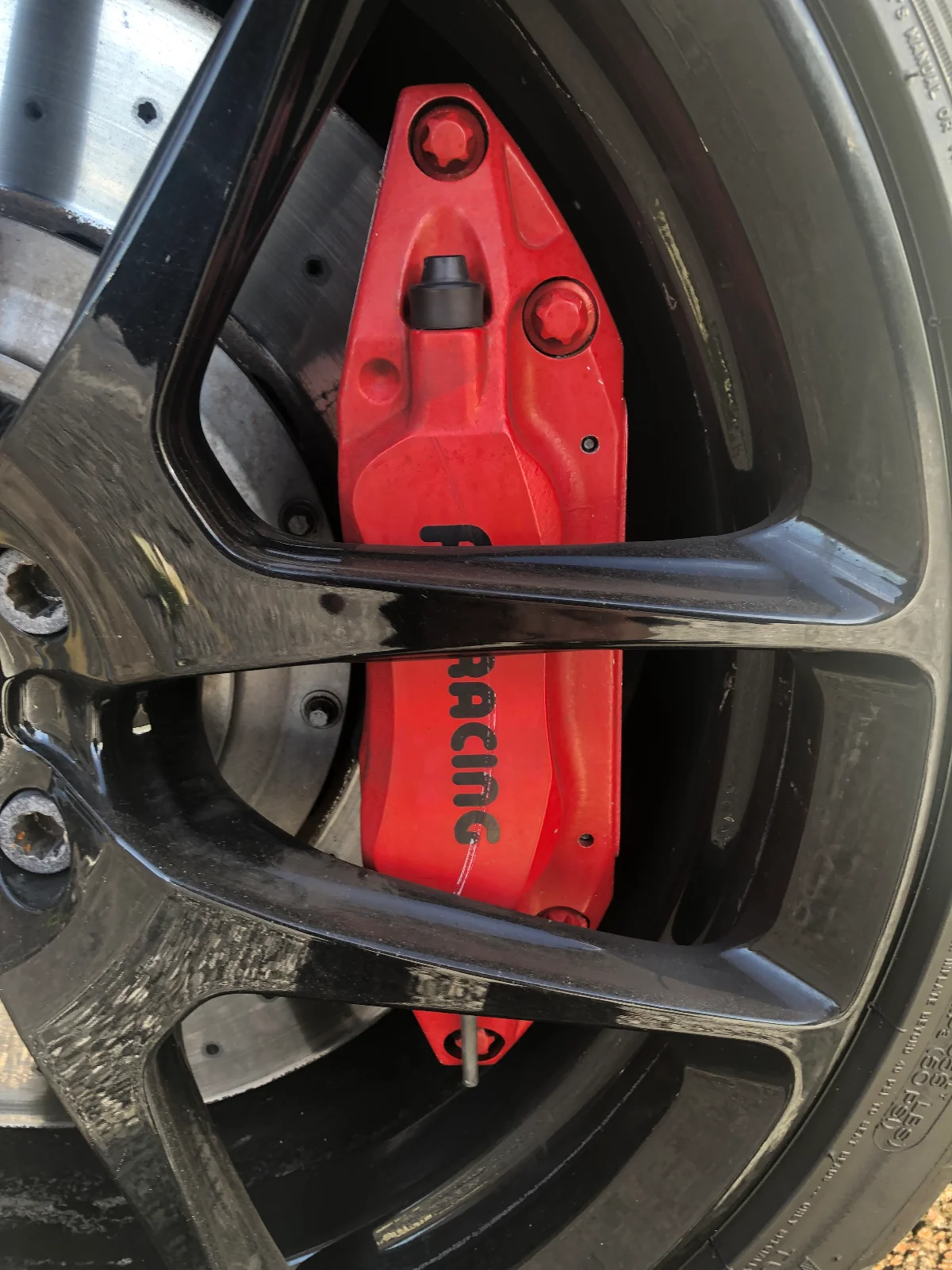 2) If you're somewhat artistically inclined, you can get matching red and black caliper paint, use masking tape to protect the edges and to concentrate the placement of the paint exclusively in the gouged area and yourself fill in the scratch using a small/thin brush. Fill the gouge so that the paint is actually raised above the surrounding surface then sand it down to level with 800 grit using wet sandpaper. Finish it off with a clear coat spray. Btw, all this should be done with the wheel off.