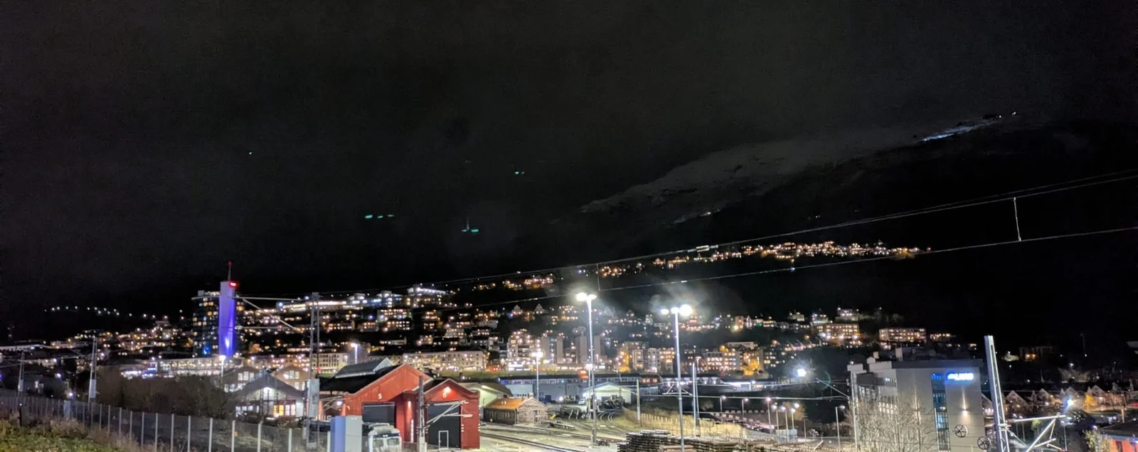 On Monday night back in Narvik in our temporary accommodation we finally got to see the Northern Lights, quite faint (the solar forecast being SP3 out of SP0-10 with SP3 being the minimum needed to see them) but they were there. They were not at all what I was expecting them to be like, they are difficult to describe and even harder to photograph, we took dozens of pictures but only 2 photos came out (even these 2 photos don't do it justice and only show a small part of the full aurora that was visible to the eye across the sky).