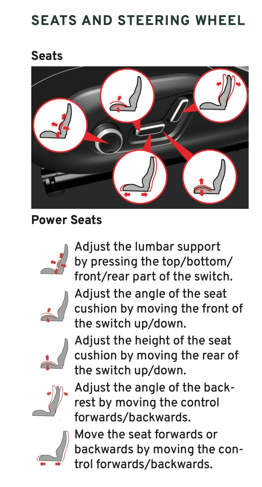 Looking at the diagram above, the order in which you should make adjustments starts with the bottom icon (seat forward or backward), then go counter-clockwise around that set of icons, with the lumbar support being the last one you adjust.