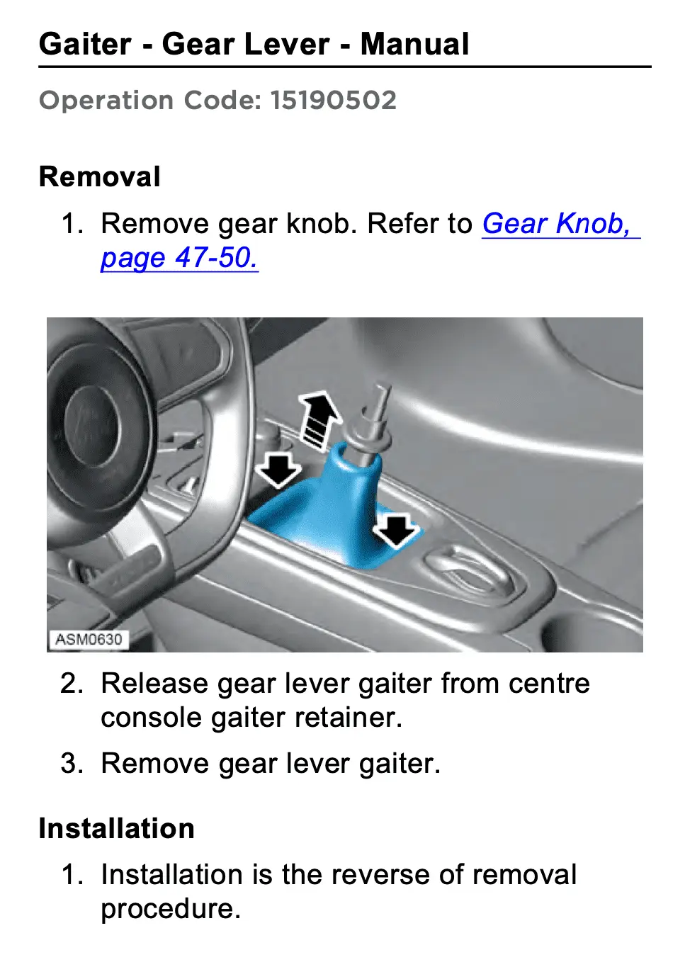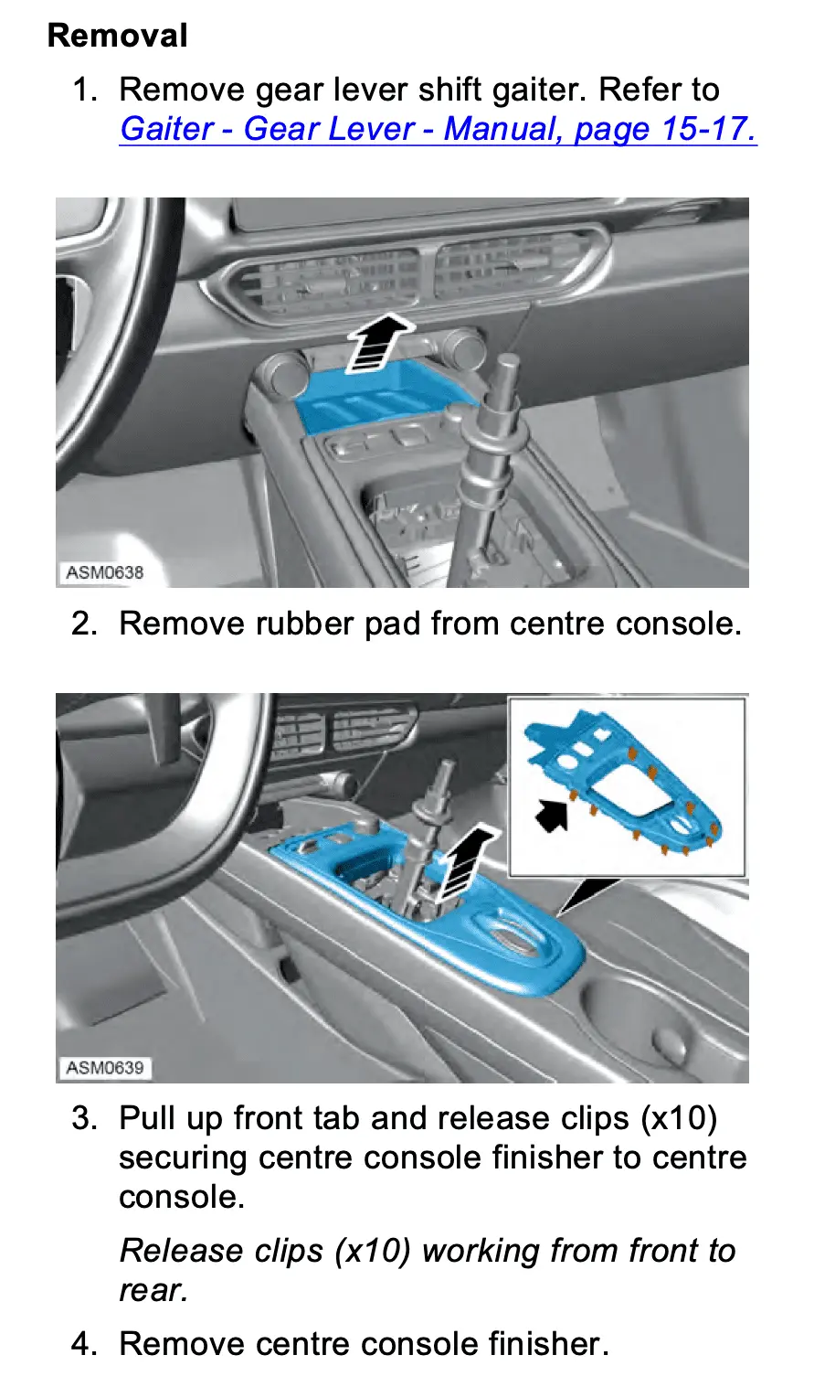 Not a whole lot of detail on how to "release gear lever gaiter from center console gaiter retainer". Sounds like you have to press down to unclip it then remove?
