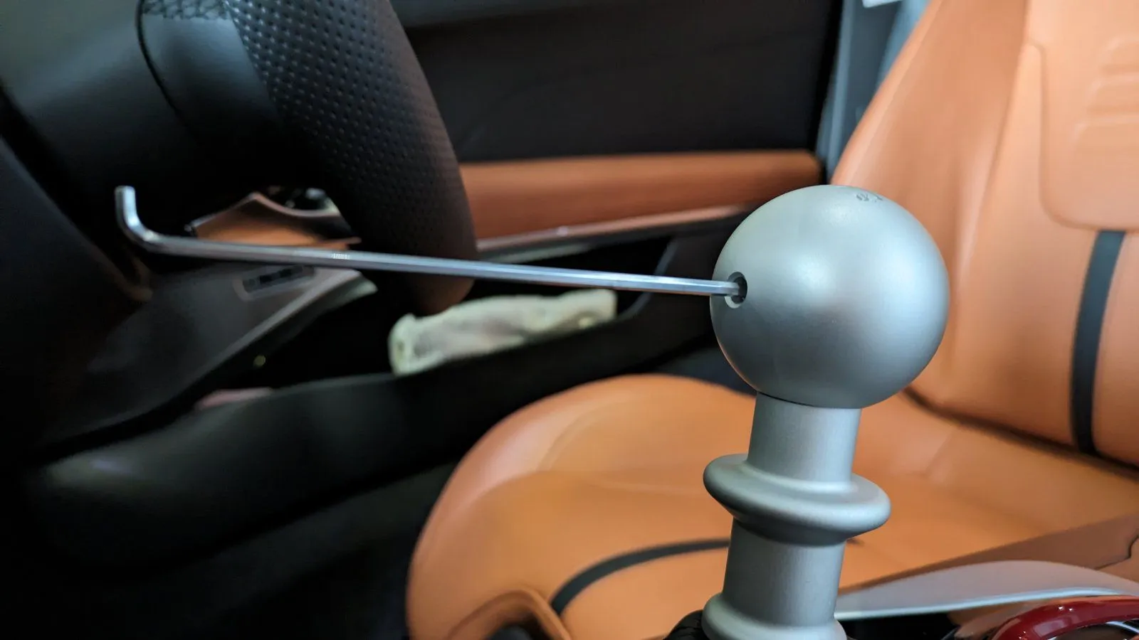 Pictures tell the story:Well, I’ve found exactly what I want to match my steering wheel and seats. It’s from Billetworkz.com. Once we figure out some of the details of the stock knob (thread pitch and lockout clearance required), I’ll chat with them and see if there is something that might fit.