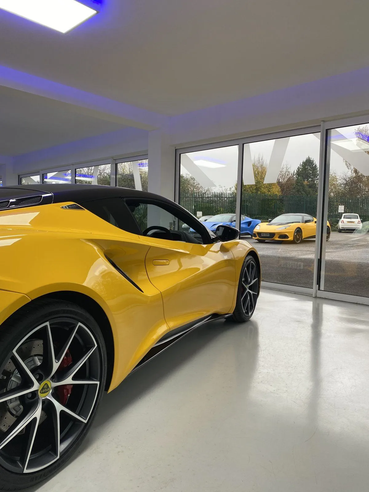 Emira notes. This car was the Hethel car with alcantara, black pack, Sport suspension, Cup tires, V6, 6sp. It was a demo car and not a production car. I was told that various changes will be made to these demo cars before production. Dealership was Marin Lotus also known as Cars Dawydiak. Very cool, little, enthusiasts dealer.