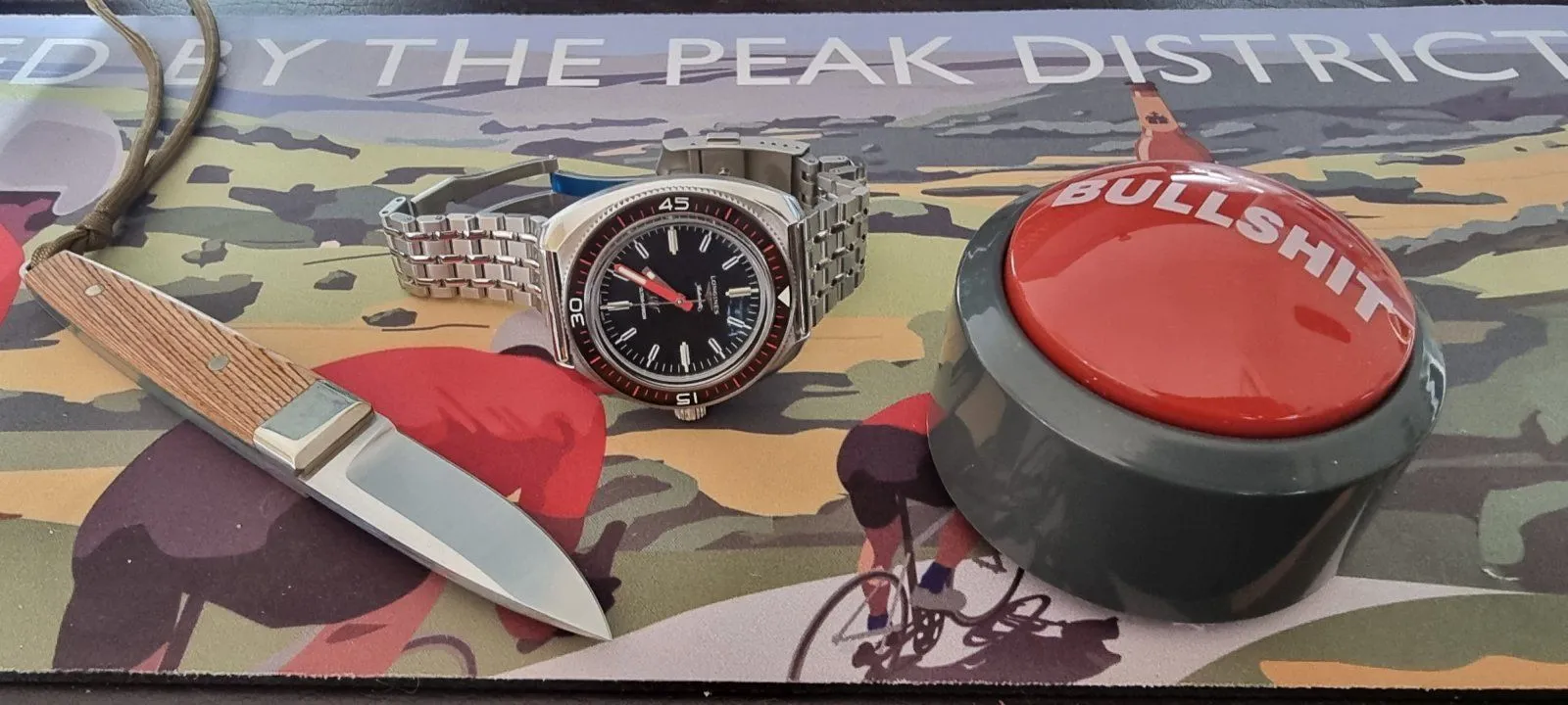 My new one on stainless, alongside the button I bought to get me through the Lotus purchase experience and the knife I got (made of spitfire propeller) in case I just can't take it anymore