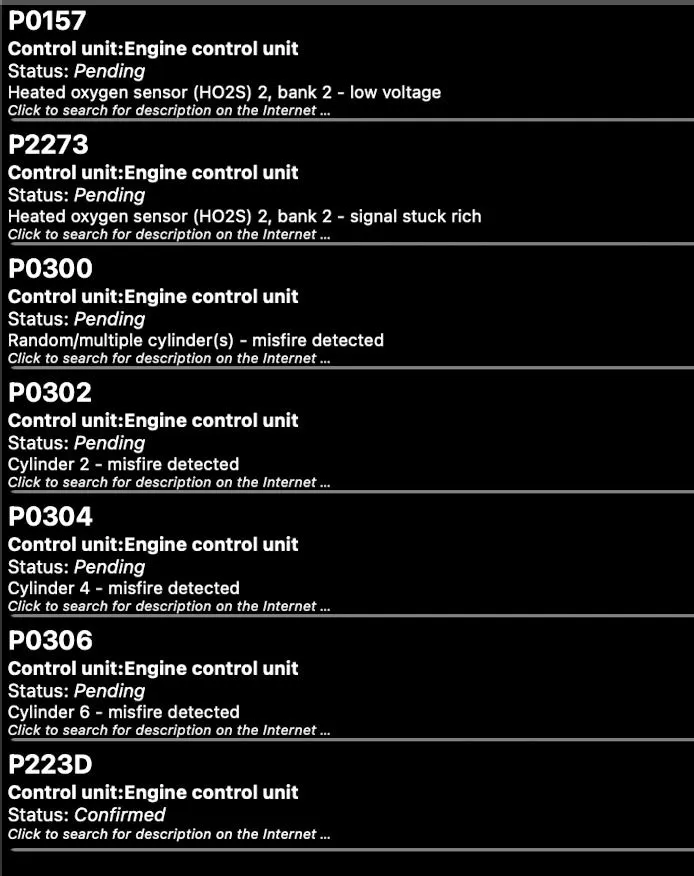 The next day, when I started the car, the CEL reappeared. Frustrated I decided to purchase an OBD reader to gather more information. Here are the codes I obtained: