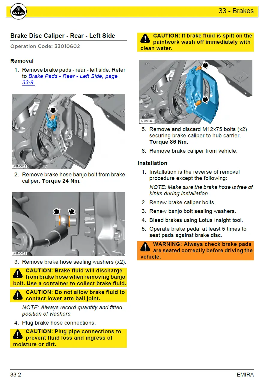 virtualmacho Supporting Member Joined Dec 21, 2021 Messages 1,830 Media 623 Reaction score 3,237 Status: Emira Owner My Specs: Emira V6 Nov 16, 2024 #2 86 Nm for both front and rear. I strongly suggest you obtain a service manual before touching the brakes... subscribe and download from here ==> https://vsic.lotuscars.com/ Upvote 0 Downvote
